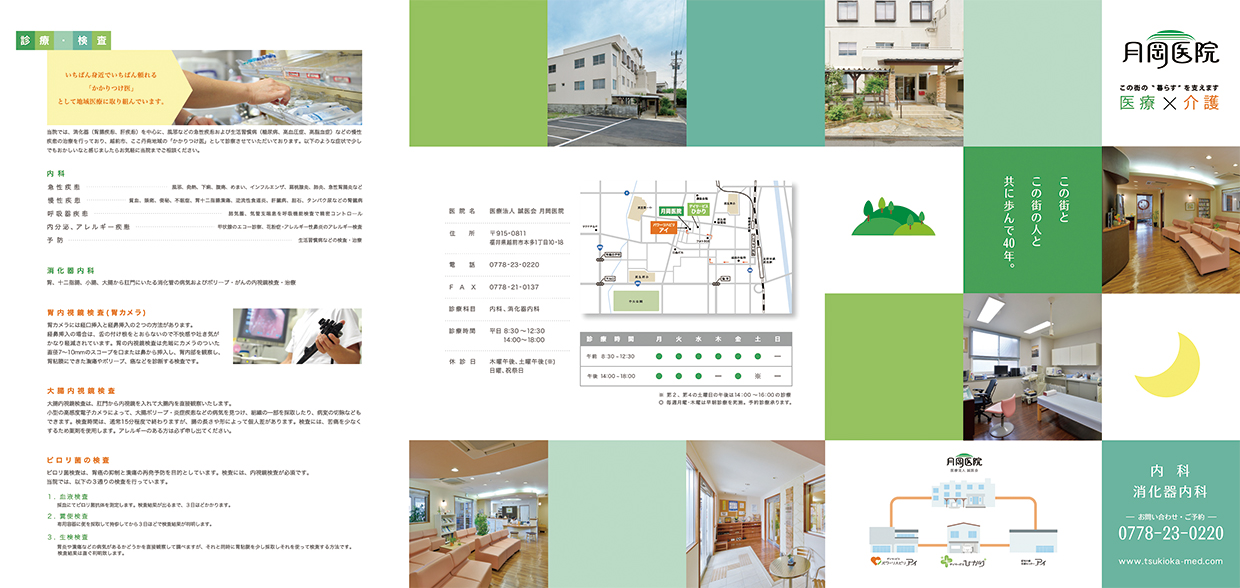 福井県越前市にある、内科・消化器内科の診療をメインに地域の介護福祉へも貢献する「月岡医院」様のコーポレートサイト制作、採用サイト、各グラフィックデザイン制作をさせていただきました。