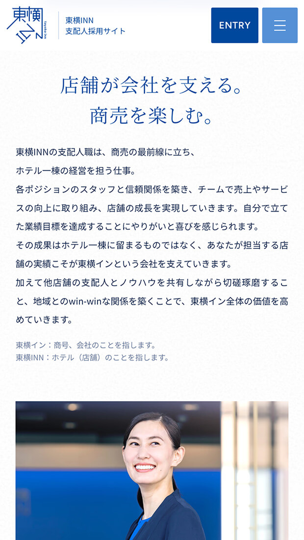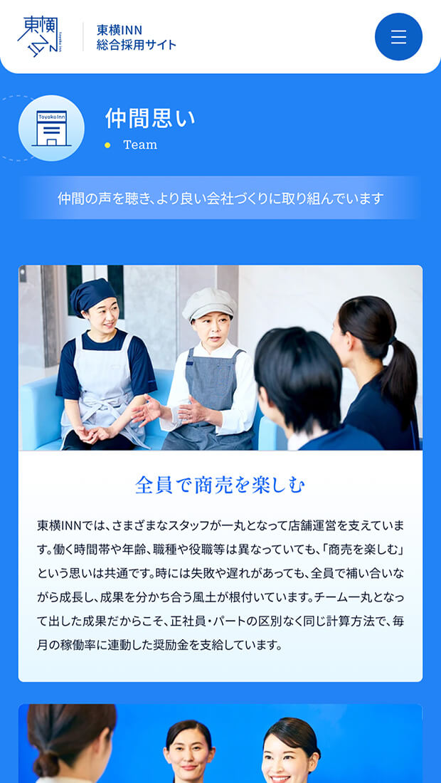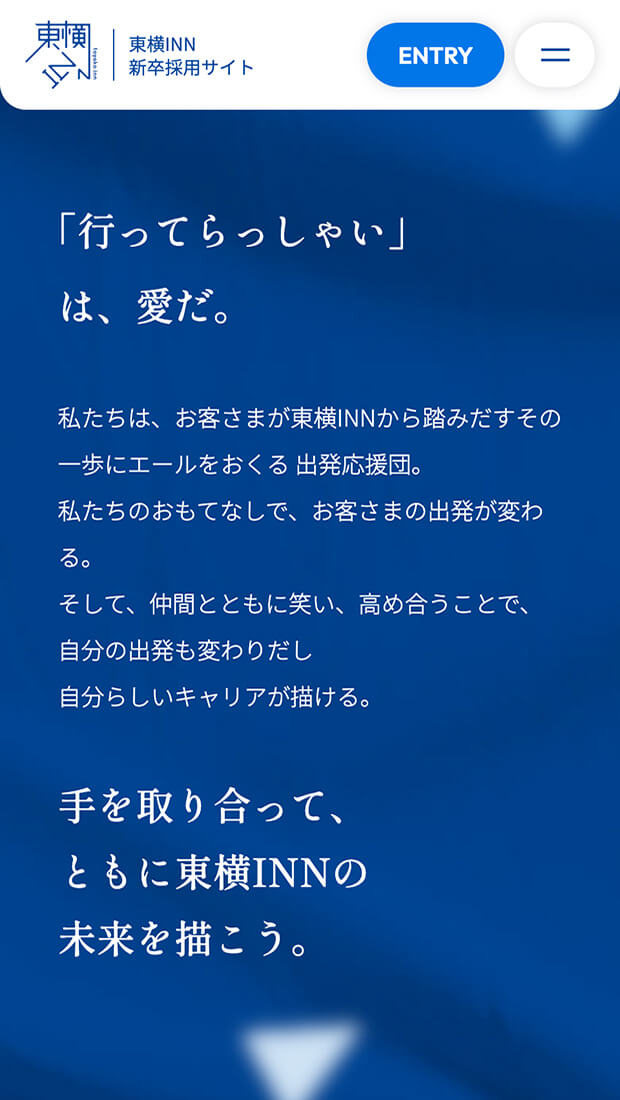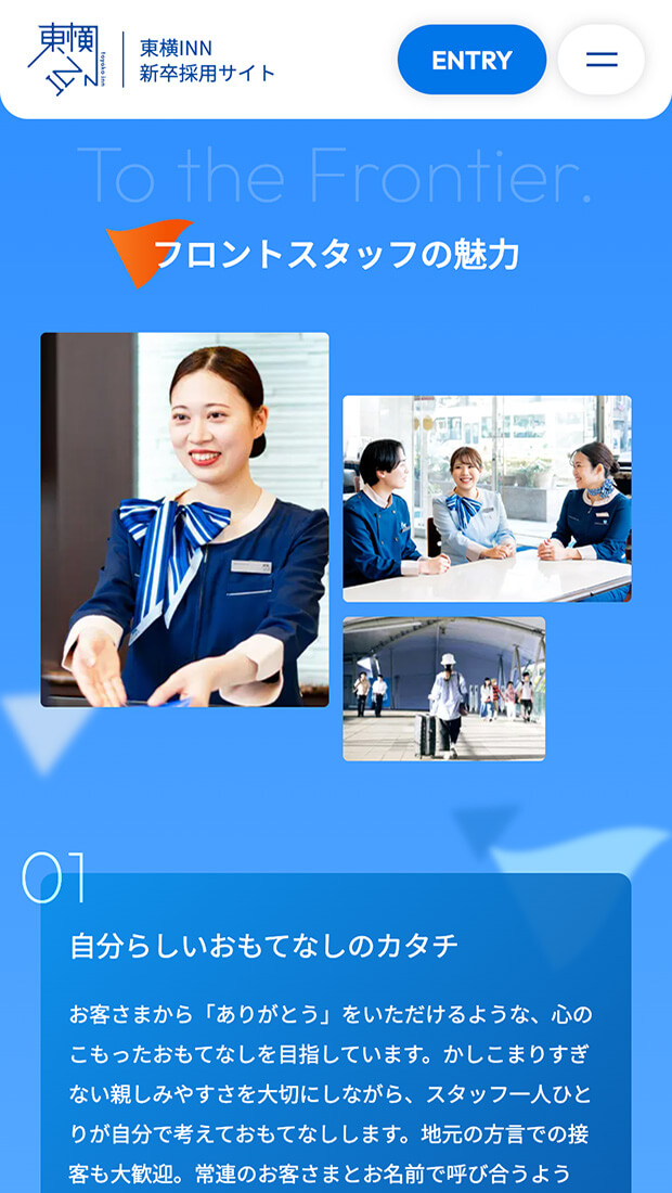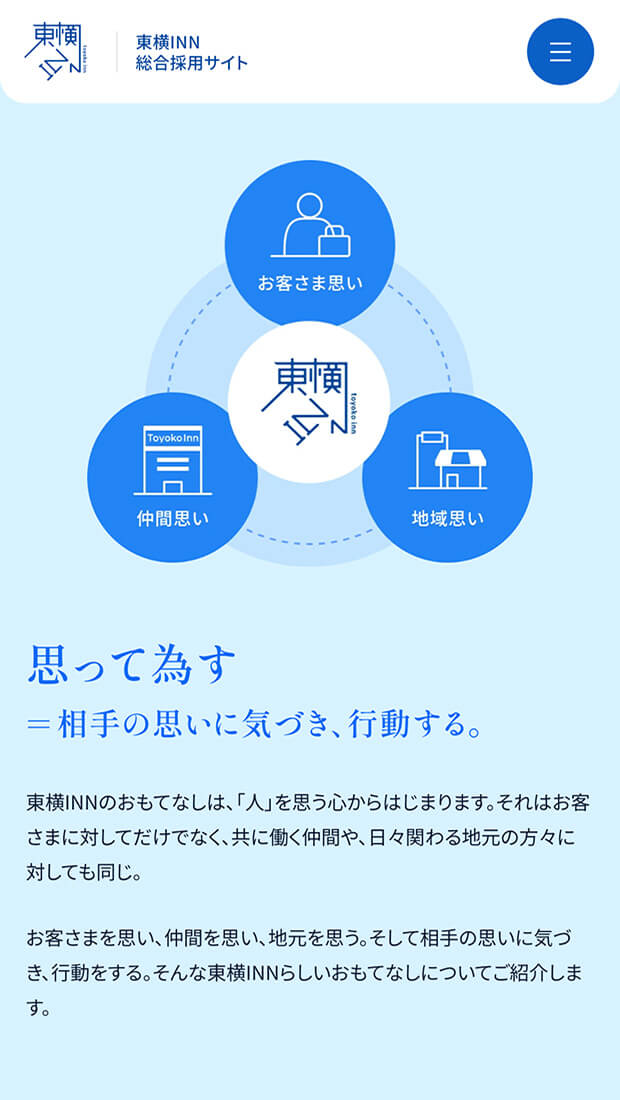 各職種の魅力へ自然に辿り着ける導線設計と併せて、企業文化を「東横INNのおもてなし」「東横INNのDNA」として整理・体系化。ブランドの核を可視化し、長期的視点で採用コミュニケーションの基盤を築きました。