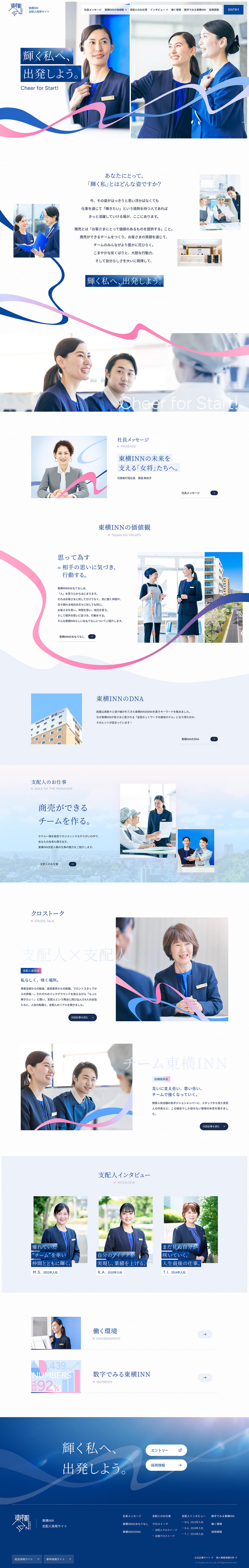 各職種の魅力へ自然に辿り着ける導線設計と併せて、企業文化を「東横INNのおもてなし」「東横INNのDNA」として整理・体系化。ブランドの核を可視化し、長期的視点で採用コミュニケーションの基盤を築きました。